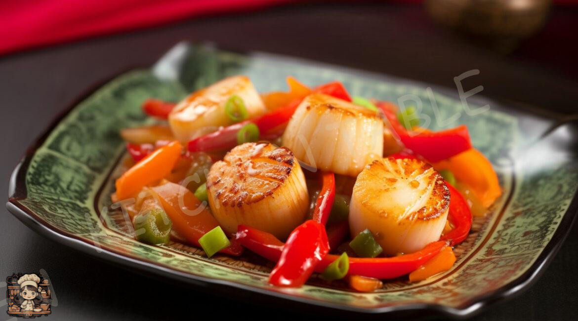• Return the cooked scallops to the wok with the peppers. Add the sauce and stir-fry everything together for an additional 1 minute until well combined. Garnish with chopped green onions. Transfer the stir-fried peppers with scallops to a serving plate.
