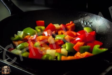 • In the same wok, add another tablespoon of oil. Add the garlic and ginger. Stir-fry for about 20 seconds until they become fragrant. Toss in the sliced bell peppers. Stir-fry for 2-3 minutes until the peppers start to soften but are still crisp.